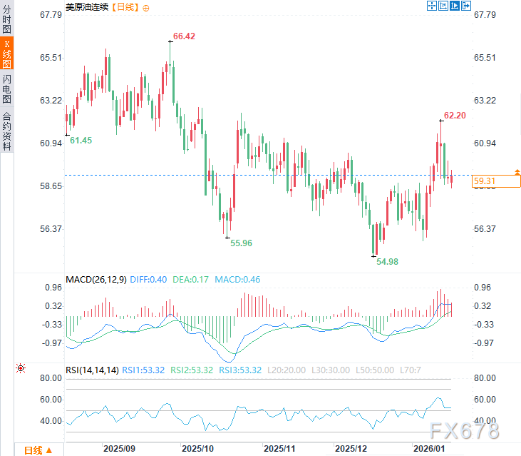 周一(1月19日)亚市时段,美原油交投于每桶59.30美元附近窄幅震荡。