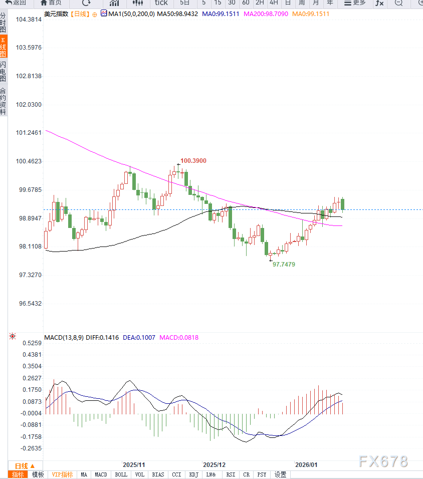 汇通财经APP讯——本周初美元整体表现疲软,美元指数下跌至99.15附近,在主要货币中处于弱势地位。市场情绪受到美国与欧洲在格陵兰问题上的外交摩擦影响,投资者对美元资产的信心有所降温。