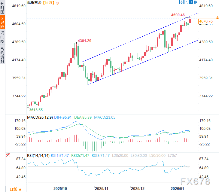 MACD指标位于零轴上方,且近期有所改善,显示看涨动能正在增强。相对强弱指数(RSI)刚刚进入超买区域,这令金价在上升通道阻力位附近(4700美元附近)承压。
