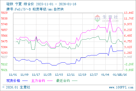 近期硅铁期货行情延续区间震荡运行态势,盘面价格波动幅度较为有限,而现货行情也是暂稳运行,整体报价微调。据生意社商品行情分析系统数据显示,截至1月16日,硅铁(牌号:FeSi75~B;粒度等级/mm:自然块)宁夏地区市场报价在5300-5450元/吨,市场均价5327元/吨,较上周五涨0.16%。