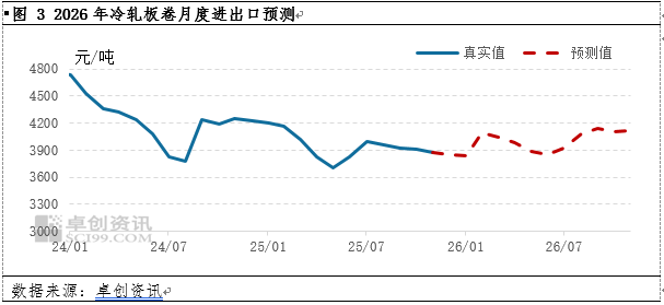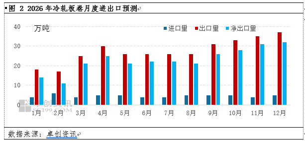 2025年冷轧板卷进口预计在58万吨左右,较上年降低,出口预计在293万吨左右较上年增加,2025年冷轧板卷净出口预计增加。预计2026年冷轧板卷进口56万吨,出口330万吨,净出口较2025年增加39万吨。从近三年冷轧板卷的出口变化来看,中国冷轧板卷资源在国际市场的接受度逐渐提高,出口结构上也从低端产品逐渐向中低端产品演化。基于此演化情况以及对国际宏观环境逐渐好转的预期,预计2026年中国冷轧板卷净出口有所增加。尽管冷轧板卷出口量相比于供应总量占比不大,但净出口的增量预期在供需差的变量中占据一定份额,一定程度作为内需压力的宣泄口。