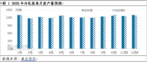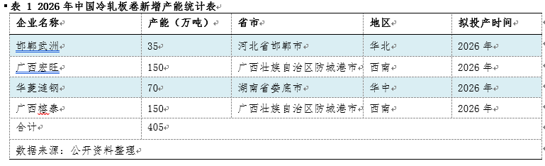 2025年,冷轧板卷产能达到16595万吨,同比增长160万吨,其中包括新增产能200万吨,产能淘汰40万吨,年度产能增速为0.97%。回顾近年来冷轧板卷产能逐年增长,基于延伸产业链,增加产品多样性,提高产品附加值方面的考虑,不乏有钢厂投产冷轧,以实现转型。同时由于近年来上游热轧板卷新投产能较多,部分钢厂也萌生了配套相关下游产能的意愿。根据卓创资讯整体的数据,2026年冷轧板卷钢厂预计新增产能情况如下表1。此预期下,预计2026年冷轧板卷产能达到17000万吨,同时需关注到预计投产的项目普遍配套了下游产线,多以镀锌为主,部分下游硅钢项目,因此产能扩张带来的供给压力预期相对较为缓和。