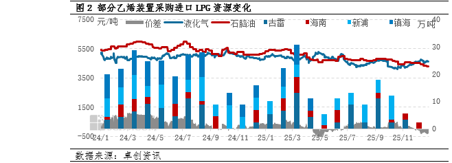 通过近两年数据可以发现,石脑油与液化气价差基本在-300-1000元/吨之间波动,当石脑油-LPG价格大于500元/吨,LPG进口量会明显增加,当小于300元/吨,乙烯企业进口量会出现一定程度下降,当石脑油-LPG价格为负值时,企业会尽量减少LPG进口,而当LPG价格过高,如2025年四季度,除去必须使用LPG的企业都将缩减或者停止LPG使用。如古雷2025年10月下旬至今,新浦11月中至今,均已经停止LPG进口。