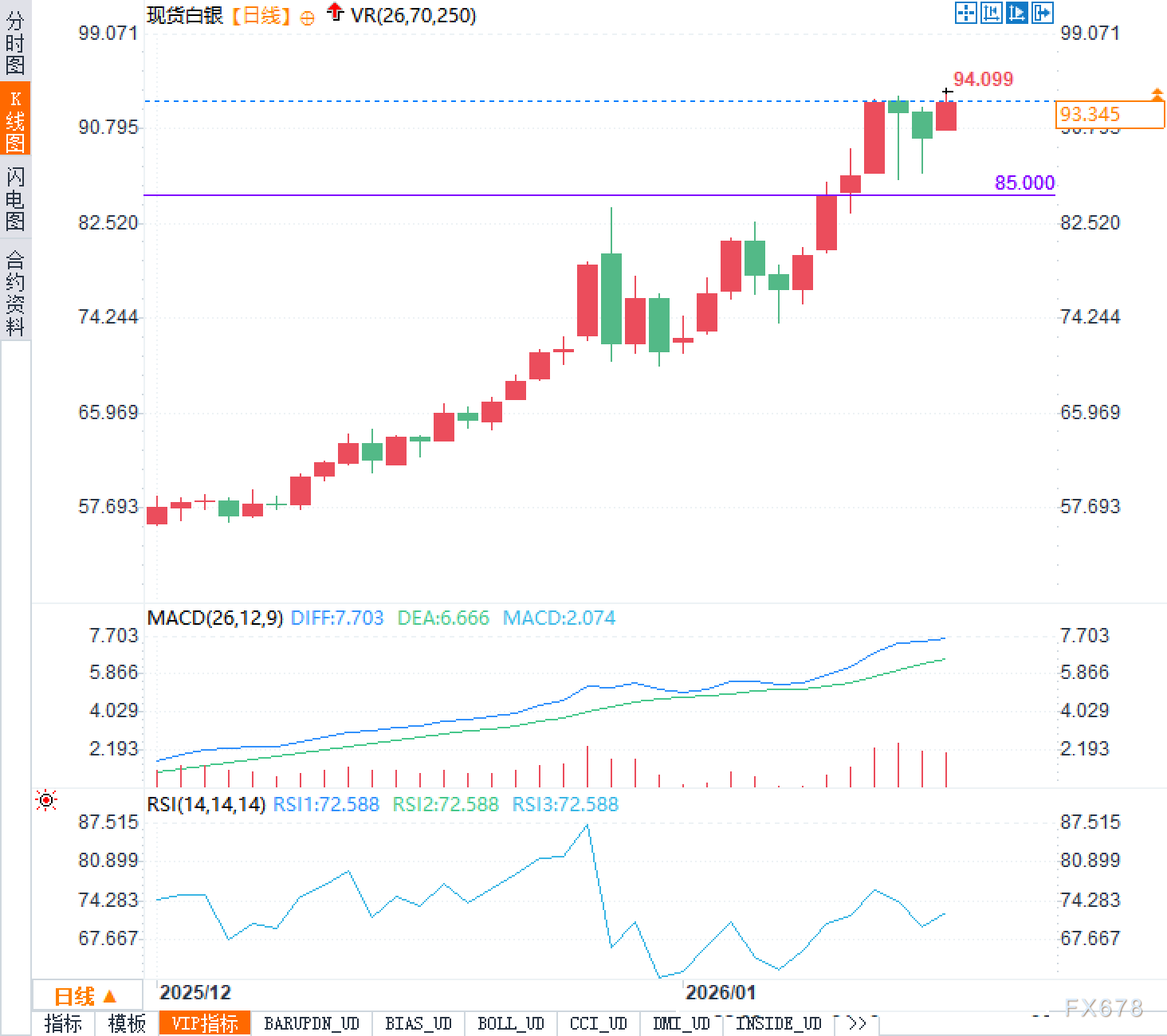 汇通财经APP讯——周一(1月19日),现货白银延续强势上攻,北美时段交投于93.40美元附近。日线结构上,多头将价格推至94.099美元附近的历史高位区域后,盘面进入高位震荡,短线资金对“继续加速上冲”与“先消化再走”的分歧开始显性化。