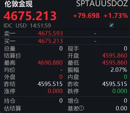 1月19日,黄金、白银价格齐创历史新高。现货市场方面,截至发稿,伦敦金现日内大涨1.73%,报4675.213美元/盎司,盘中最高触及4690美元/盎司,创历史新高;伦敦银现攻势更猛,日内飙升3.75%,报93.514美元/盎司,最高上探至94.12美元/盎司。