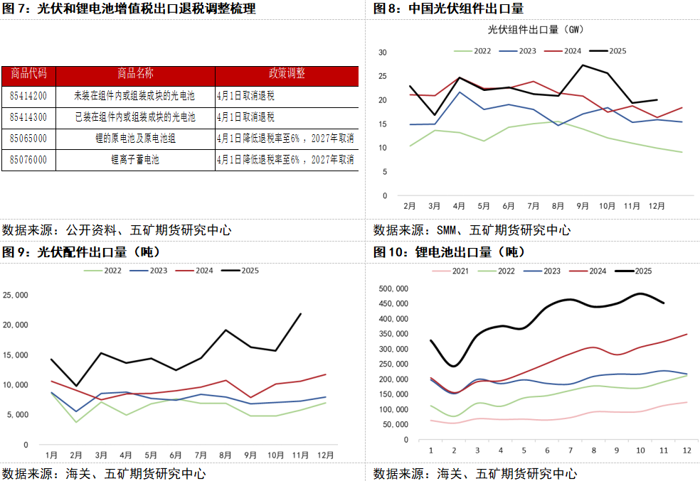 不过,近期铝价已有一定程度的回调,下游需求有望边际回暖。虽然国内春节长假临近,铝锭库存将季节性增加,但预计增幅不会超季节性。与此同时,1月9日财政部和国家税务总局发布公告,自4月1日起取消光伏等产品的增值税出口退税,自4月1日至12月31日,将电池产品的增值税出口退税率从9%下调至6%,并从2027年起取消出口退税。此次调整涉及的铝下游主要有光伏组件、光伏组件部件和锂电池,可以预见,取消出口退税前国内将出现一定的“抢出口”现象,并将提振相关产品的需求。