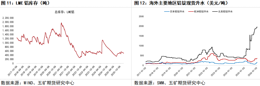 海外方面,近期LME铝库存重新回落,Cash/3M升贴水走强,现货重新升水期货,表明现货供需边际改善。当前北美铝锭现货升水维持历史高位,同时欧洲和日本铝锭现货升水也有一定程度走强,海外现货对铝价的支撑作用更明显。