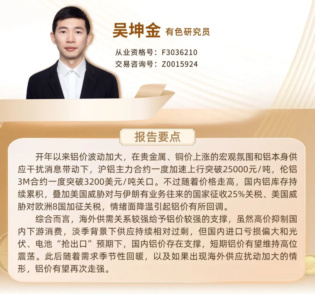 开年以来铝价波动加大,在贵金属、铜价上涨的宏观氛围和铝本身供应干扰消息带动下,沪铝主力合约一度加速上行突破25000元/吨,伦铝3M合约一度突破3200美元/吨关口。不过随着价格走高,国内铝库存持续累积,叠加美国威胁对与伊朗有业务往来的国家征收25%关税、美国威胁对欧洲8国加征关税,情绪面降温引起铝价有所回调。