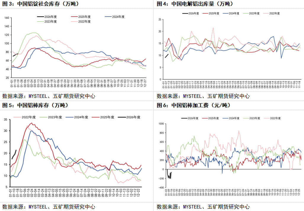 国内供需方面,年初以来随着铝价上涨,国内下游需求受抑制,初端加工企业开工率偏稳,但整体开工水平不高,铝锭出库量较去年同期水平偏低,铝锭社会库存量连续增加,截至1月19日库存量约76.4万吨,接近2022-2023年同期水平。铝价上涨过程中铝棒加工费也表现偏弱,铝棒库存也出现一定程度的累积。