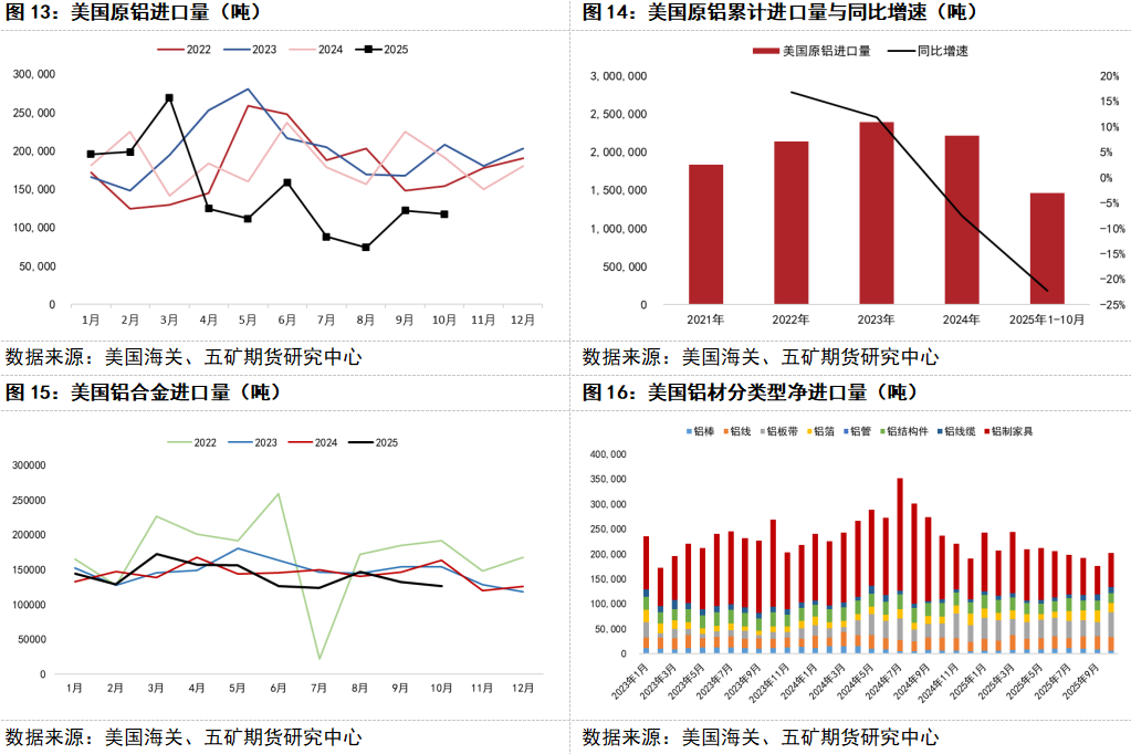 根据美国官方公布的数据,2025年10月美国原铝进口量接近9月份,脱离7-8月的低进口量,由于1-10月进口量降幅较大,叠加美国铝现货进口窗口持续开启,美国原铝的进口需求还有增长空间。同时,10月美国铝材净进口量边际回升,其中铝板带进口量增长幅度较大,表明美国随着库存消化,对铝产品的进口需求开始提升。海外铝消费相对乐观。