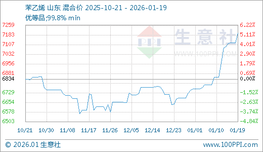 01月19日苯乙烯7196.00元/吨10天上涨5.05%