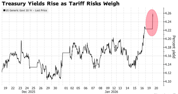 由于美国对格陵兰岛征收关税的威胁削弱了对美国资产的需求,并加剧了人们对华盛顿长期财政状况的担忧,美国国债也加入了全球债券的抛售行列。由于周一美国国债休市,10年期和30年期美国国债收益率在亚洲交易时段均上涨至少3个基点。美国总统特朗普计划对部分欧洲国家征收关税,以图吞并格陵兰岛,此举再次引发了人们对其政府政策不可预测性的质疑。