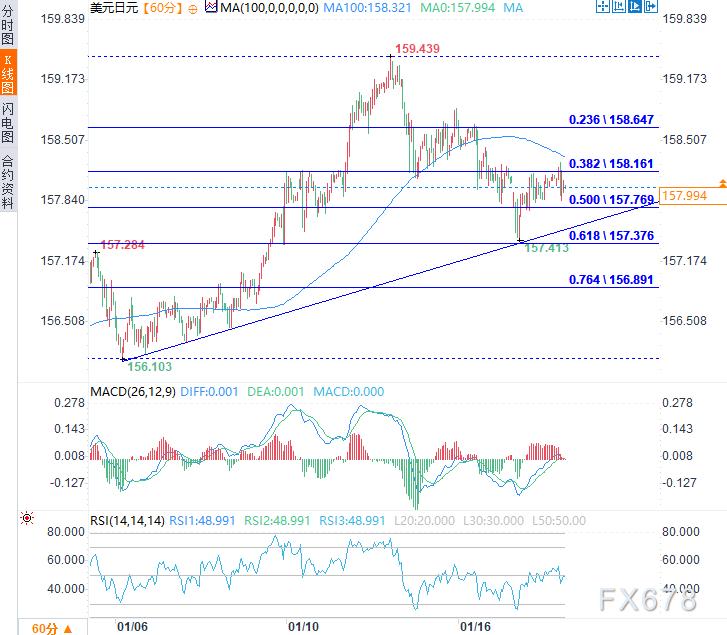 美元/日元自1月低点反弹后,其从61.8%斐波那契回撤位(157.38)的隔夜回升走势缺乏延续性,未能有效突破38.2%斐波那契回撤位(158.16),并在100小时简单移动平均线(SMA,158.32)前方遇阻回落,目前该均线构成关键枢轴点。汇价持续运行于此下行均线下方,维持看跌倾向。