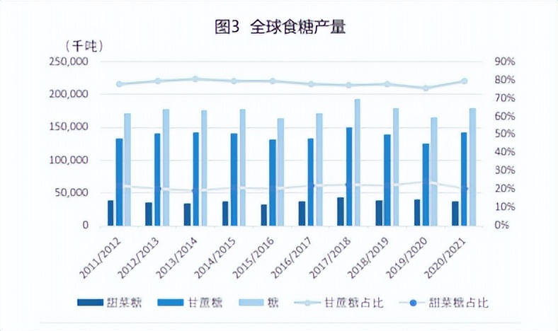 20/21年度全球食糖产量1.8亿吨(原糖值),其中甘蔗糖产量1.43亿吨(原糖值),甜菜糖产量0.37亿吨(原糖值)。甘蔗糖产量占比约为79%,甜菜糖产量占比约为21%。近10年来,甘蔗糖与甜菜糖的份额变化不大,甘蔗糖占比在76%-81%之间波动,甜菜糖占比在19%-24%之间波动。