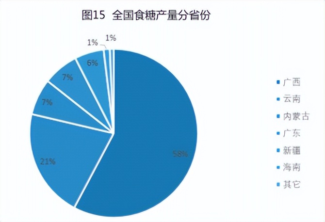 我国食糖产地主要集中在广西、云南、广东、海南、新疆、内蒙等省和自治区。其中广西、云南、广东、海南生产甘蔗糖,新疆、内蒙生产甜菜糖。广西是第一大主产区,20/21年度,广西产糖629万吨,占全国总产量的58%。