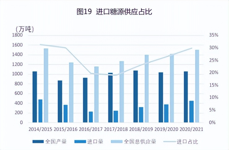 最近几年进口糖源在全国总供应中的占比呈先降后升的趋势,20/21年度进口糖源占比达到30%。