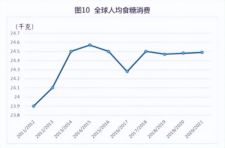 从人均食糖消费看,20/21年度,全球人均食糖消费24.49千克/年*人,与上年度基本持平。从11/12年度到20/21年度,人均食糖消费量大趋势增长,中间经历过回落。