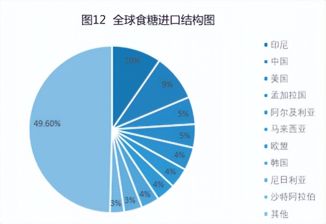 20/21年度,全球食糖进口量为5398.6万吨(原糖值),占总产量的比例为30%。前十大进口国和地区分别为:印尼、中国、美国、孟加拉国、阿尔及利亚、马来西亚、欧盟、韩国、尼日利亚、沙特阿拉伯,前10大进口国和地区进口量占总进口量的比例为50.4%。