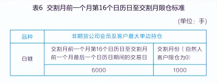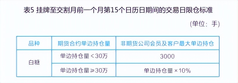 期货交易实行限仓制度。限仓是指交易所规定会员或者客户按单边计算的、可以持有某一-期货合约投机持仓的最大数量。白糖期货合约对期货公司会员不限仓。白糖期货合约自合约挂牌至交割月前一个月第15个日历日期间的交易日,当合约的单边持仓量大于或等于一定规模时,非期货公司会员和客户按单边持仓量的10%确定限仓数额;当合约的单边持仓量小于一定规模时,非期货公司会员和客户按绝对量方式确定限仓数额。具体限仓标准见下表: