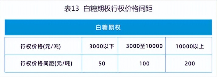 行权价格是由期权合约规定的,买方有权在将来某一时间买入或卖出期权标的物的价格。行权价格间距是指相邻两个期权合约行权价格的差。行权价格间距设置及合约挂牌数量参照的标准是能够覆盖次日标的期货合约价格的波动范围。白糖期权行权价格间距依据行权价格分段设计,具体如下: