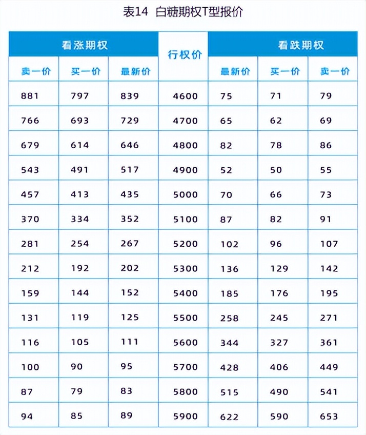 上表是一个以白糖期货为标的物的期权T型报价表,左侧为看涨期权,右侧为看跌期权,中间按照期权合约行权价由小至大顺序(也可以是逆序)纵向排列。上表数字部分第一行,左侧数据为行权价为4600元/吨的看涨期权行情信息,最新成交价为839元/吨,当前买- -价为797元/吨,卖一价为881元/吨;右侧数据为行权价为4600元/吨的看跌期权行情信息,最新成交价为75元/吨,当前买一价为71元/吨,卖一价为79元吨。