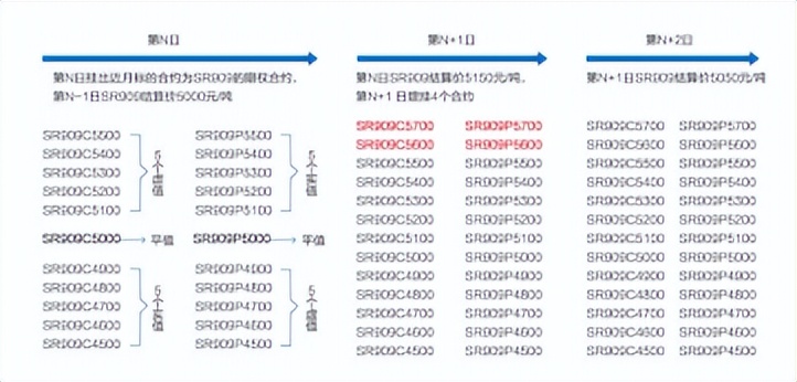 白糖期权以白糖期货前一交易日结算价为基准,按行权价格间距挂出5个实值期权、1个平值期权和5个虚值期权。以白糖期权为例:白糖期货SR909于2018年3月15日挂牌,但当日持仓量不足5000手。在7月5日持仓达到5032张,当日结算价为4991元/吨,那么下一个交易87月6日,以SR909为标的物的看涨(跌)期权挂牌合约为:平值期权合约SR909C(P)5000,5个实(虚)值期权合约SR909C(P)4900、SR909C(P)4800、SR909C(P)4700、 SR909C(P)4600、SR909C(P)4500,5个虚(实)值期权合约SR909C(P)5100、SR909C(P)5200、SR909C: (P)5300、SR909C(P)5400、SR909C(P)5500。