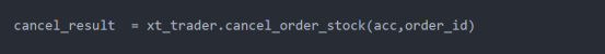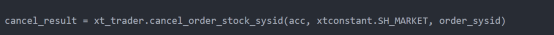 cancel_result返回0表示撤单命令下达成功,-1表示撤单失败,结果是0不一定撤单成功了,这里只是告诉我们已经成功下达了撤单命令,这点大家需要理解到位。比如12点的时候我们下达了撤单,返回值是0,此时是无法撤单成功的,需要等开盘以后才可以。根据柜台合同编号为order_sysid撤单,从查询当前委托里面可以拿到order_sysid的值。
