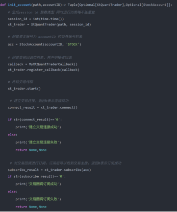 首先定义一个初始化函数,用于连接miniQMT的交易,代码如下: