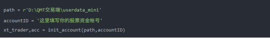 path 这里替换成QMT实际的userdata_mini目录的路径。这样我们就得到了XtQuantTrader和StockAccount2个对象