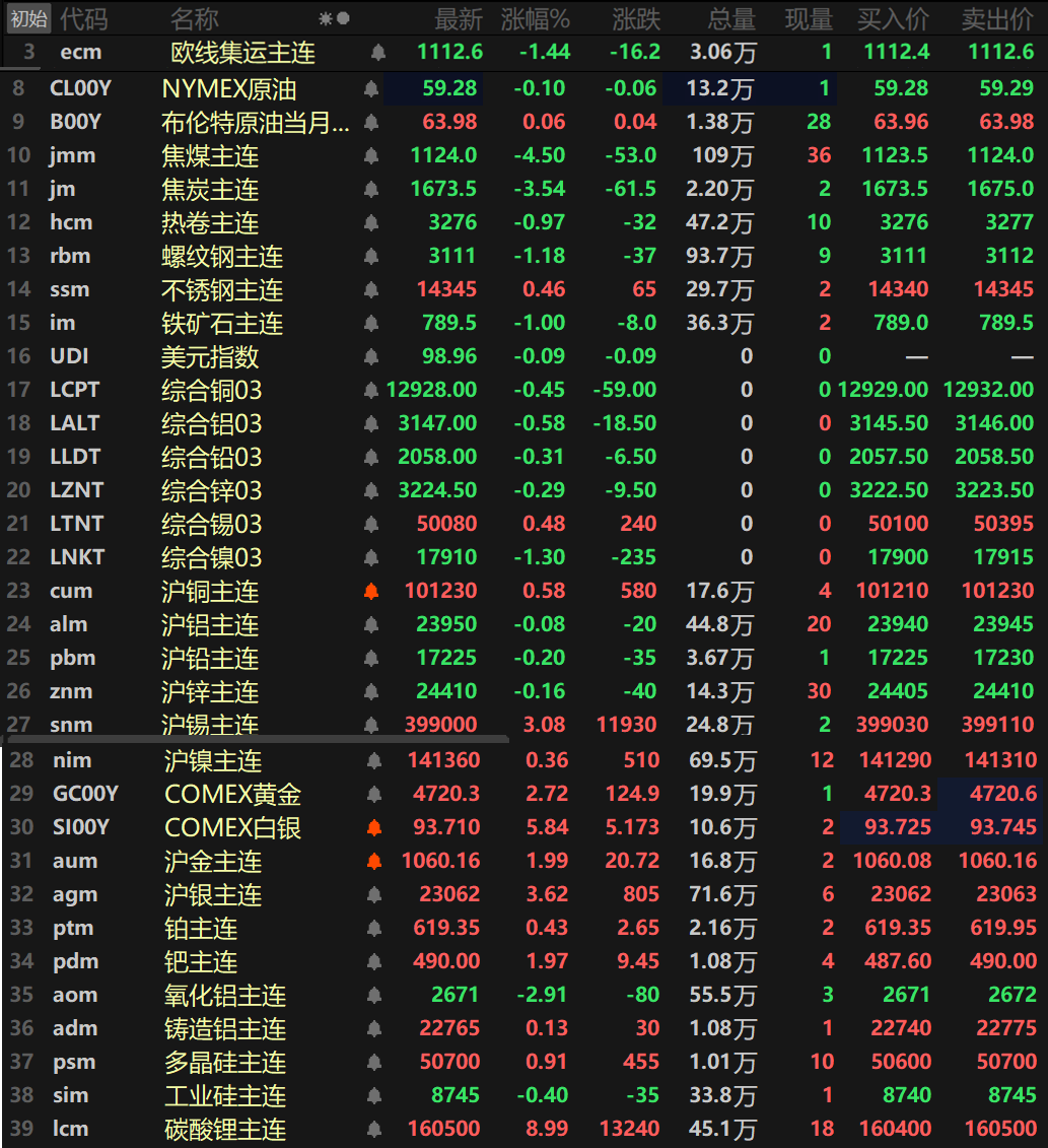 此外,碳酸锂主连临近收盘以8.99%的涨幅涨停封板,报160500元/吨。多晶硅涨0.91%,工业硅跌0.4%。欧线集运主连跌1.44%报1112.6。