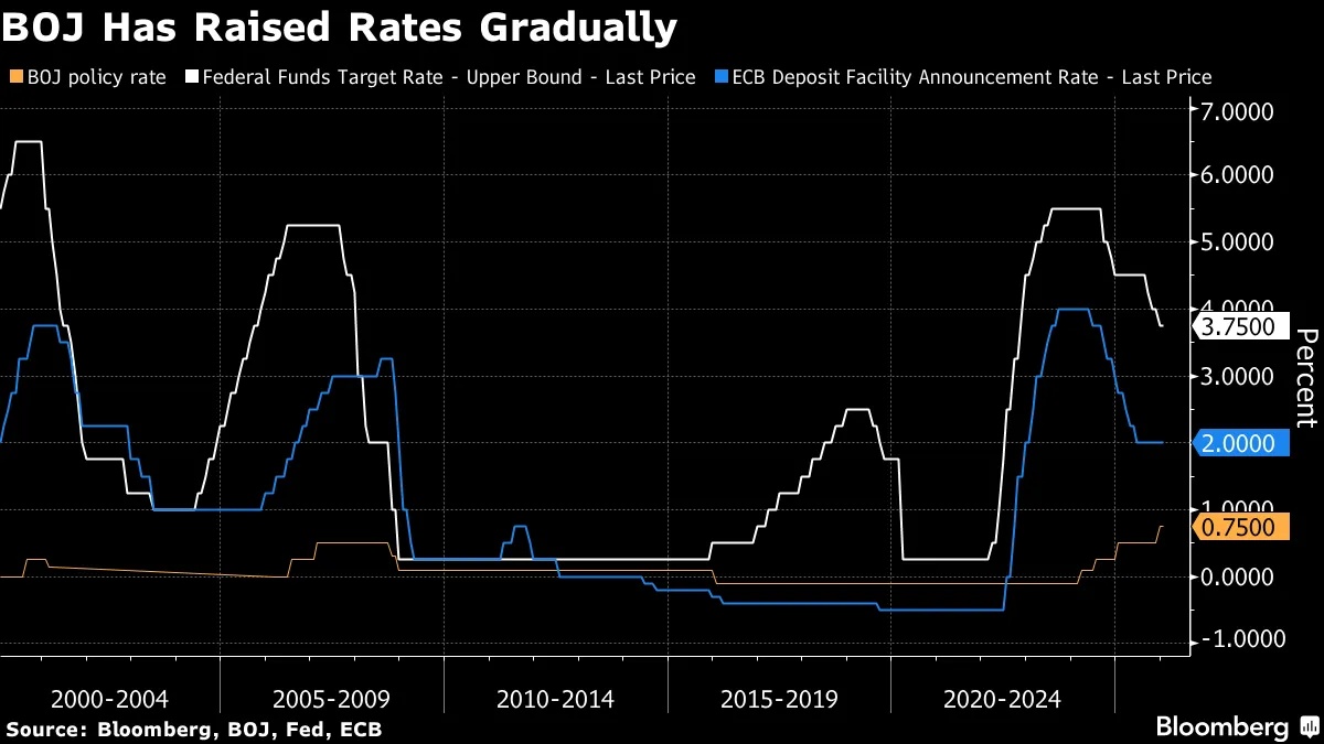 尽管日本央行是去年唯一加息的主要央行(而且加息两次),但这些举措未能扭转日元的颓势。日本的利率在主要经济体中仍然仅次于瑞士,位居第二低。