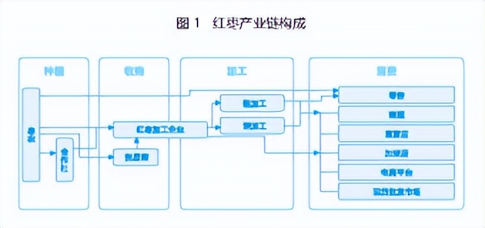 红枣产业链分为四个环节,分别是红枣种植、红枣收购、加工生产、终端消费。总体来看,红枣产品加工水平较低,红枣产业链较短。