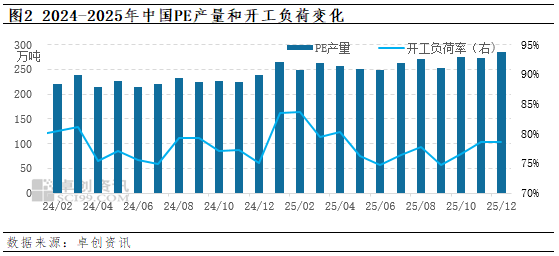 从整体来看,2025年12月份PE开工负荷率在78.55%,较去年同期提升3.53个百分点,然开工负荷较11月缺小幅下降,环比下降0.11个百分点。12月份国内石化PE检修损失量环比增加,然月内排产天数较11月多1天,且广西石化产量释放,因此PE国产量增加,在284.36万吨,环比增3.98%,同比增19.15%。进口方面,随着北美清库货源以及中东货源陆续到港,预计12月进口量或有增加。整体来看,12月份PE整体供应量存增加预期。2026年1月上半月国内PE检修损失量较2025年12月同期有所减少,加之进口存增加预期,预计整体PE供应或将小增。