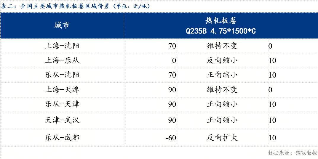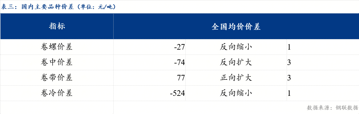 从品种价差来看,卷螺差较上一交易日反向缩小1元/吨,热中价差较上一交易日反向扩大3元/吨,热带价差较上一交易日正向扩大3元/吨,热冷价差较上一交易日反向缩小1元/吨。