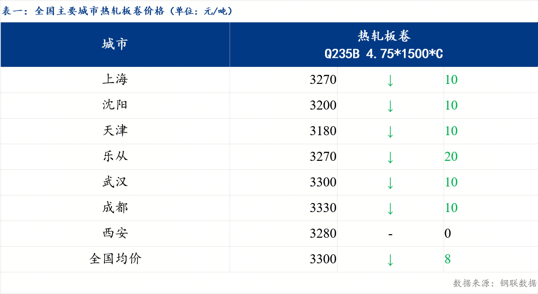 截至发稿,今日4.75热轧板卷全国均价3300元/吨,较上一交易日下跌8元/吨。其中主要城市价格为上海3270元/吨,沈阳3200元/吨,天津3180元/吨,乐从3270元/吨,武汉3300元/吨,成都3330元/吨,西安3280元/吨。