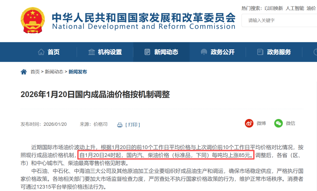 1月20日,国家发展改革委官网发布消息称,根据1月20日的前10个工作日平均价格与上次调价前10个工作日平均价格对比情况,按照现行成品油价格形成机制,自1月20日24时起,国内汽、柴油价格每吨均上涨85元。