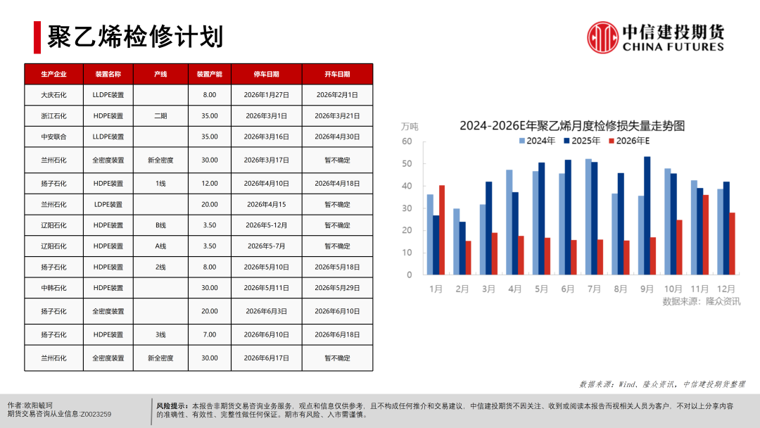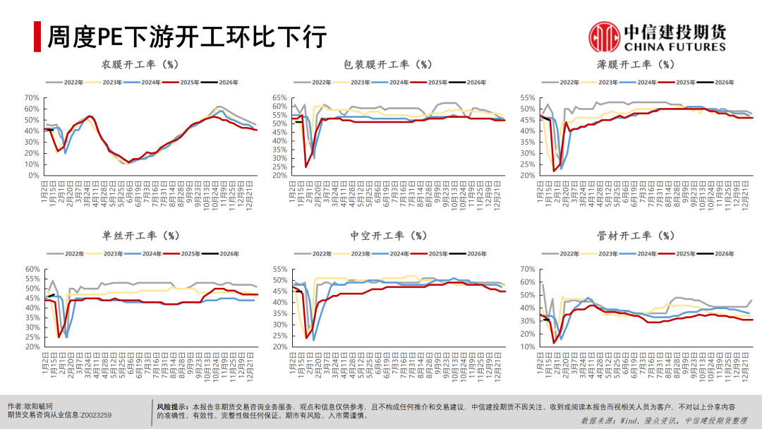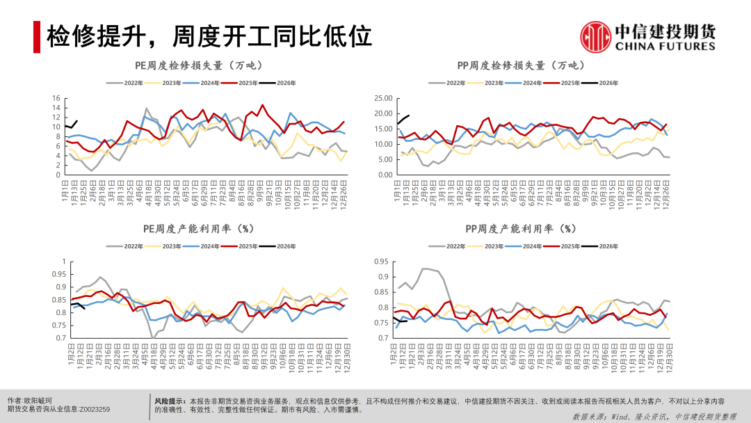 国内供应:近两周原油价格受地缘影响整体延续反弹趋势,聚烯烃成本端存一定支撑。估值视角看,聚烯烃/原油比价周度延续下行,估值同比处于中性水平。油制利润短期并未有太大起色,但国内长链条一体化装置的抗亏损能力较强,边际上影响开工的多为煤制、PDH等装置,短期检修提升,开工环比下行。长周期视角看2026年检修量同比2025年上行,但供应预计总体仍在高位。