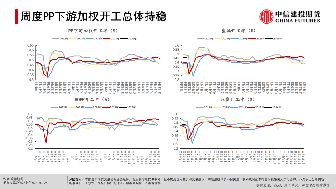 需求:PE下游开工跟随季节性属性环比下行,农膜对价格支撑减弱;PP下游BOPP开工提升,整体下游开工率环比稳中略有上行。