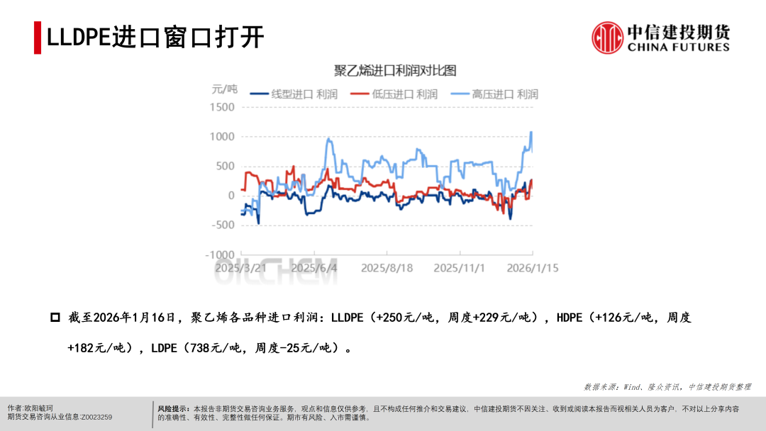 海外供应:PE部分LLDPE、HDPE、LDPE周度进口利润出现显著修复,LLDPE进口窗口打开,但仍需关注后续现货价格能否持稳,短期进口增加来自于前期在途货源的集中到港。