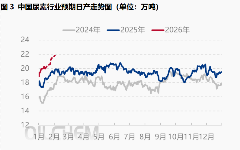 2025年下半年,有关部门通过配额制调节了尿素出口的节奏,当时市场利好并未显现。但日积月累的出口终于在四季度出现支撑,产量压力得到消化,伴随着冬储、高氮肥需求的提升,企业库存自2025年10月下降至今,已连续下降近3个月。近期,尿素价格相对偏高,日产量也有明显提升,库存量下降趋势放缓。但短期看,未来一两周很难有库存明显增加的迹象显现。