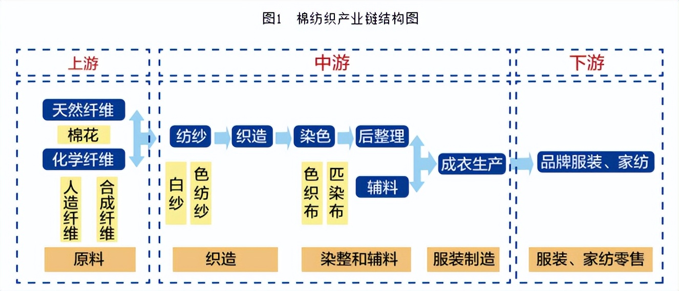 在棉纺织行业产业链中,上游是指纺织纤维的生产,提供纺织品生产所用的原材料;中游是指棉纺织品的制造、染整和辅料、服装制造环节,通过纺纱、制造、染色、后加工、成衣生产等过程使纤维原料变成纺织成品;下游是指棉纺织品的销售流通环节,通过各种销售渠道使服装、家纺等纺织品进入终端消费者手中。