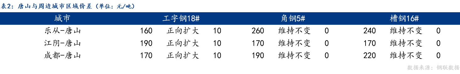 从区域价差来看,今日唐山与乐从、江阴、成都工字钢价差正向扩大,与角钢、槽钢价差维持不变;