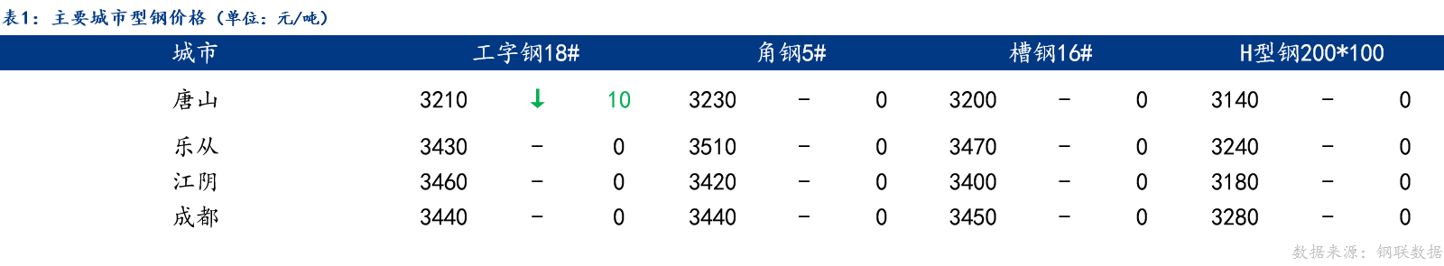 今日型钢价格持稳,唐山工字钢价格较上一交易日下跌10元/吨,与角钢、槽钢、H型钢价格较上一交易日持稳;乐从、江阴、成都工字钢、角钢、槽钢、H型钢价格较上一交易日持稳。