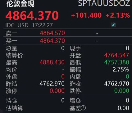 1月21日,国际金价持续攀升,首次突破4800美元/盎司整数关口。截至记者发稿,伦敦金现日内大涨2.13%,现报4864.37美元/盎司,盘中最高触及4888.43美元/盎司,再次刷新历史纪录。