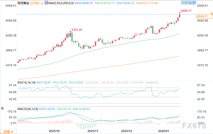 在突破4,000美元/盎司这一曾被视为“天堑”的价格仅三个月后,国际金价正以强劲势头向5,000美元大关逼近,涨势之迅猛超出多数机构年初预期。1月21日周三前市交易中,纽约商品交易所黄金期货主力合约涨幅扩大至2.1%,盘中交投于4,820美元/盎司上方,距离5,000美元整数关口仅一步之遥。而在前一交易日(1月20日),受多重利空消息共振影响,金价单日暴涨3.7%,收于创纪录的4,759.60美元/盎司,单日171.20美元的涨幅不仅刷新历史极值,更创下近十年最大单日涨跌幅比,彰显市场对黄金的狂热追捧。