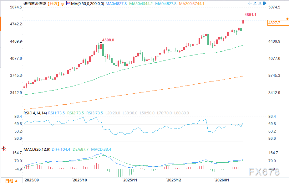 从技术面来看,2月黄金期货多头的下一个上行目标是收盘价突破5000.00美元/盎司的关键阻力位;空头的短期下行目标则是推动期货价格跌破4539.10美元/盎司的强劲技术支撑位。第一阻力位为历史高点4891.10美元/盎司,其次是4900.00美元/盎司;第一支撑位为隔夜低点4761.50美元/盎司,其次是4700.00美元/盎司。