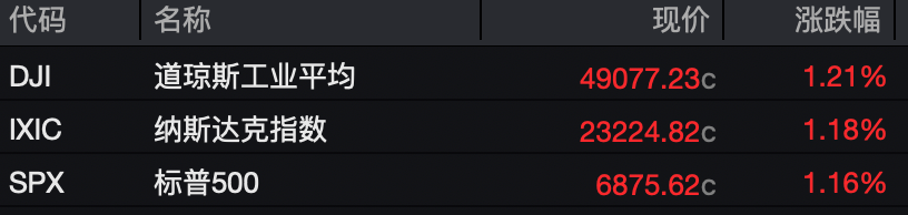 美股方面,昨夜美股三大指数全线收涨,道指涨1.21%,标普500指数涨1.16%,纳指涨1.18%。