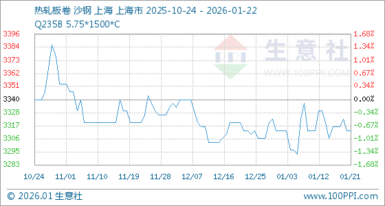1月22日,生意社热轧板卷基准价为3313.33元/吨,与本月初持平。