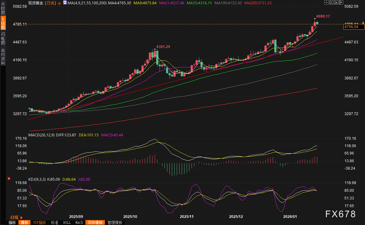 汇通财经APP讯——在2026年的开局阶段,全球金融市场犹如过山车般剧烈波动,而黄金作为传统的避险资产,再次成为投资者关注的焦点。周三(1月21日),美国总统特朗普围绕格陵兰岛的强硬立场及其突然的转折,直接搅动了金市格局。金价创下纪录高位后回落,但本周整体涨幅仍保持正向,这不仅反映出地缘政治风险的瞬息万变,还凸显了黄金在不确定性时代的核心价值。周四(1月22日)亚市早盘,现货黄金震荡走弱,再度失守4800关口,目前交投于4780美元/盎司附近,跌幅接近1%,本交易日将出炉美国11月PCE数据和初请失业金人数变动,投资者需要重点关注。