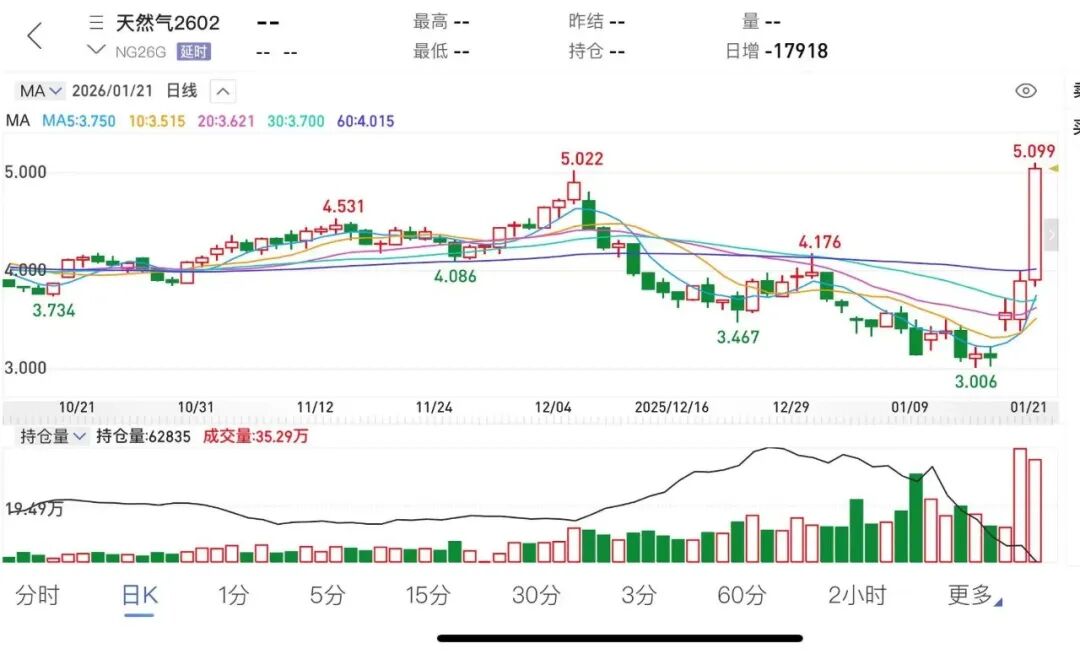截至收盘,美国天然气期货2602合约报5.099美元/百万英热,最近三个交易日累计涨逾66%。